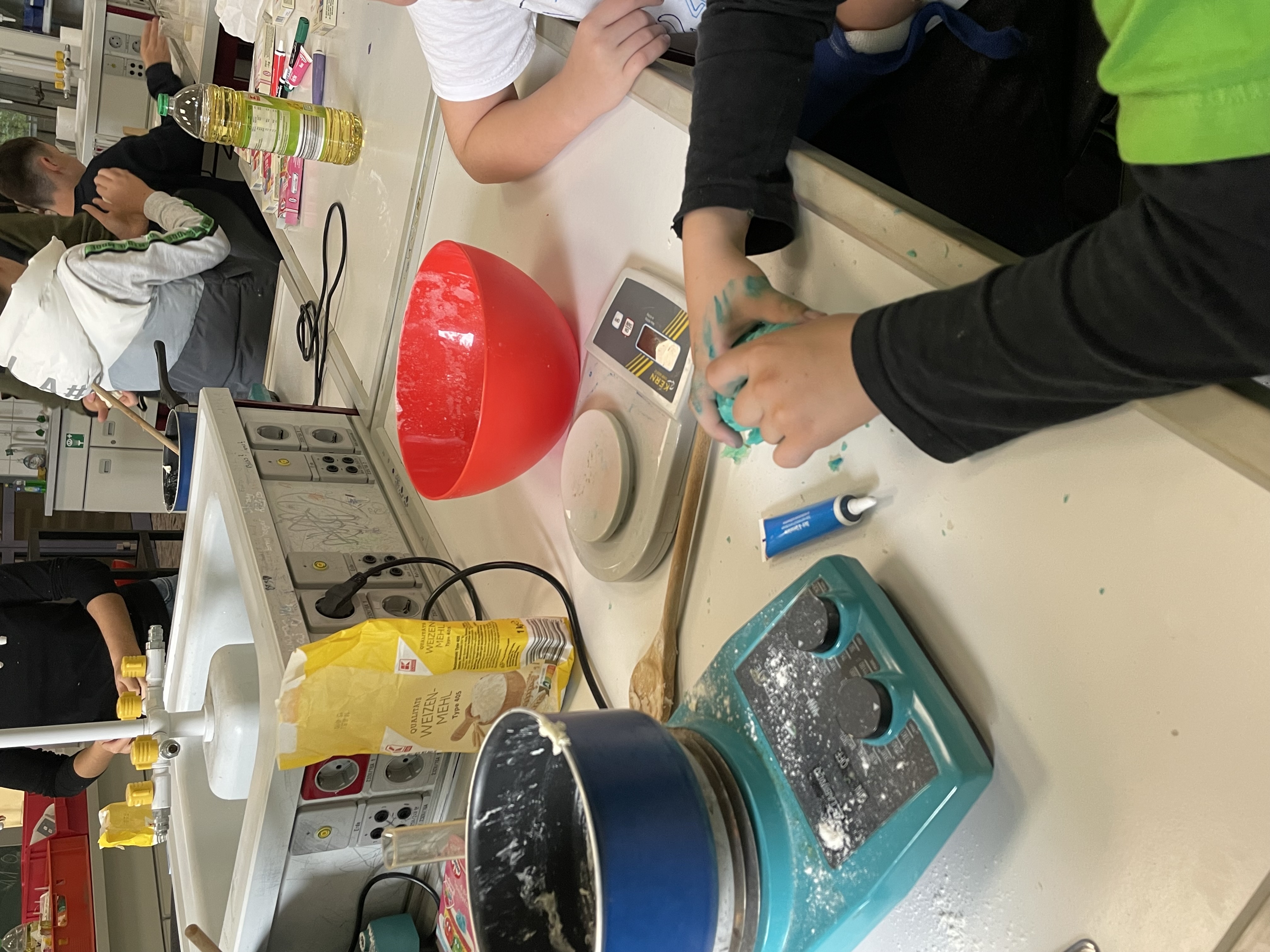 | Bei „Feuer und Flamme“ stellten die ViertklässlerInnen mithilfe von OberstufenschülerInnen Knete her oder ließen mit ihren neuen chemischen Kenntnissen Farben elegant verlaufen. | ![]() |