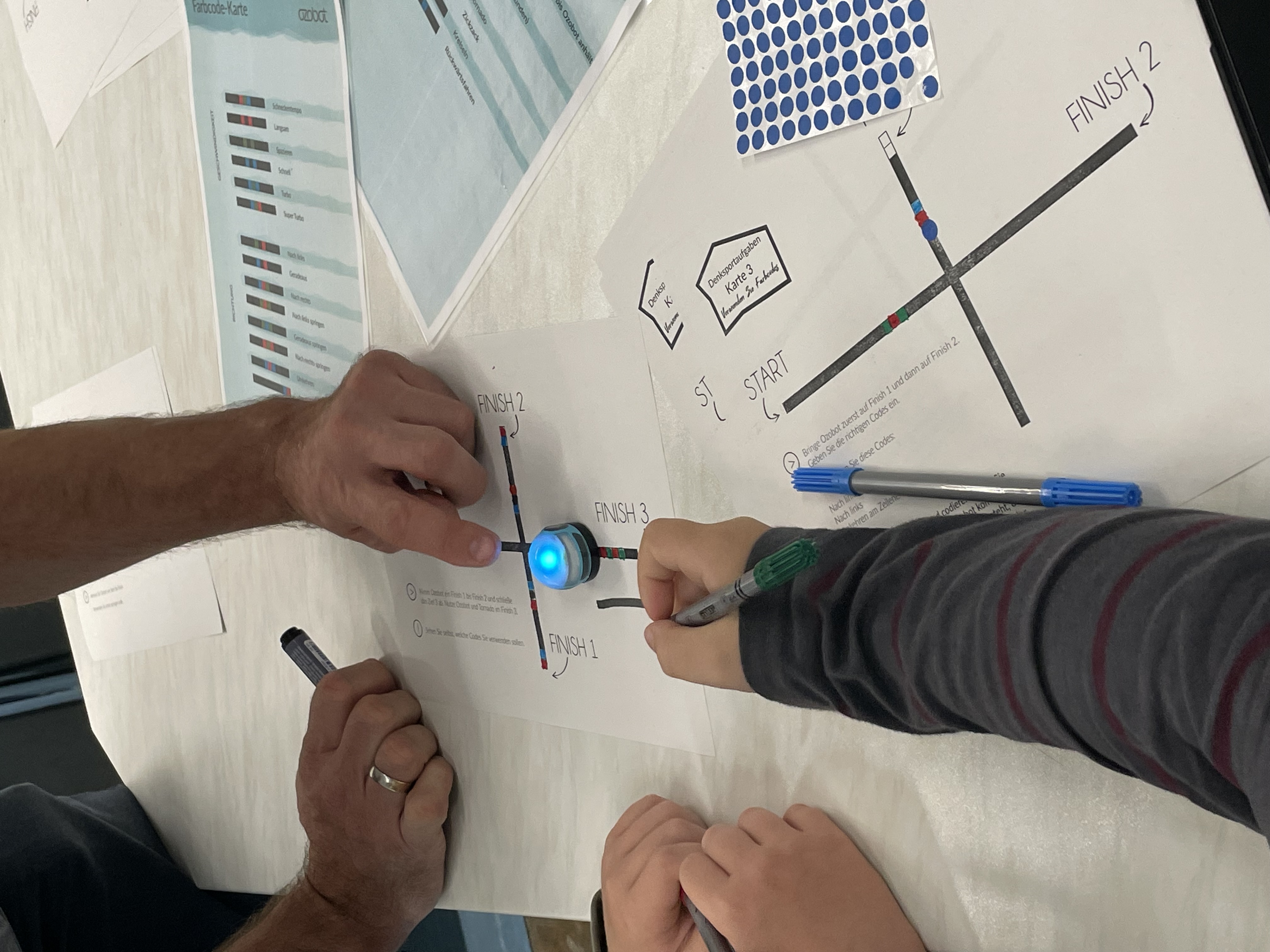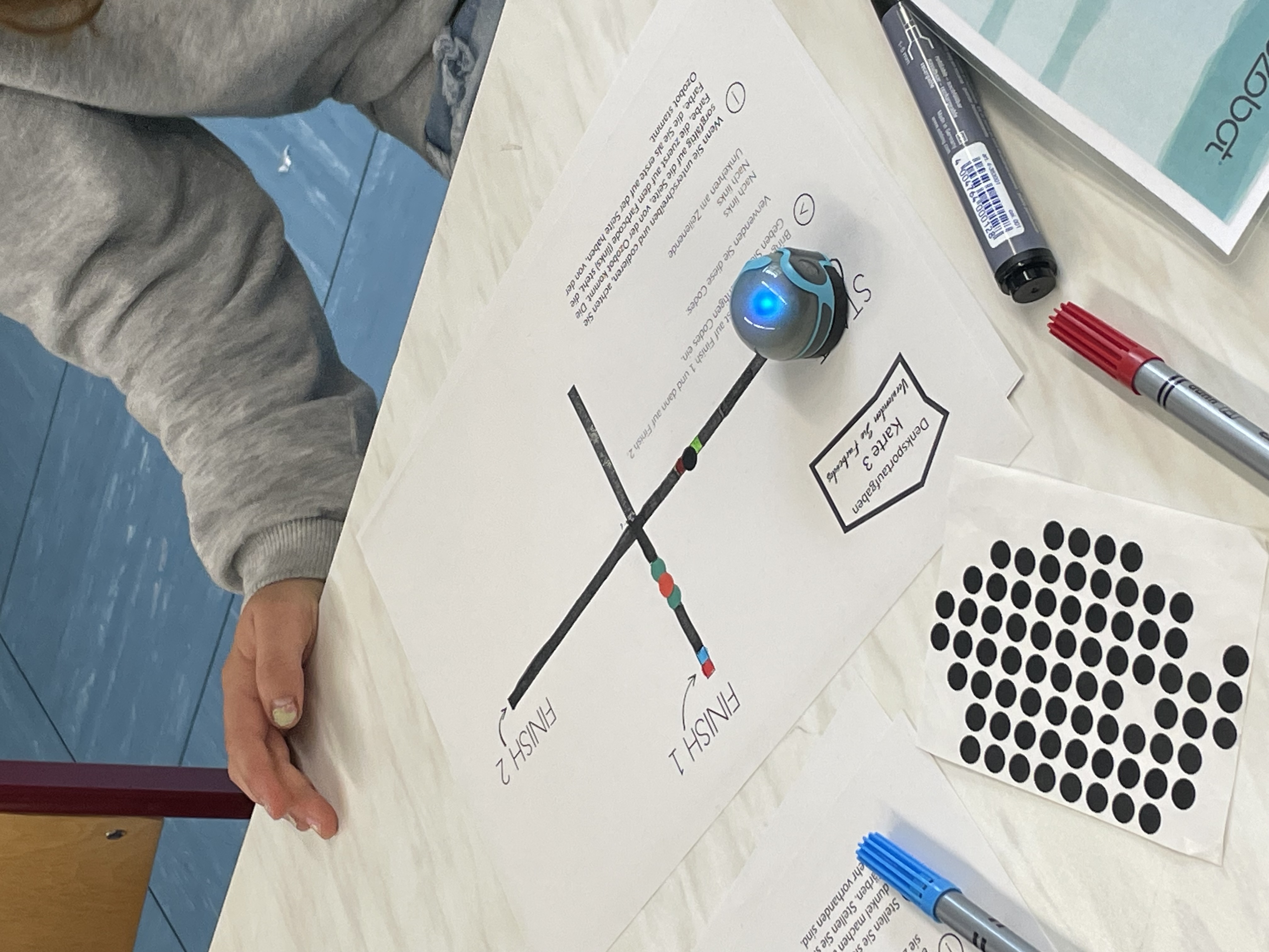 Auf Papier oder digital: Im Informatikraum halfen andere dem kleinen „Ozobot“, seinen Weg zum Ziel zu finden: gar nicht immer so einfach! Hier war eine ruhige Hand gefragt. Doch dann überwand der „Ozobot“ sogar eine „Schlucht“ auf dem Papier und rollte hinüber zur anderen Linie. |